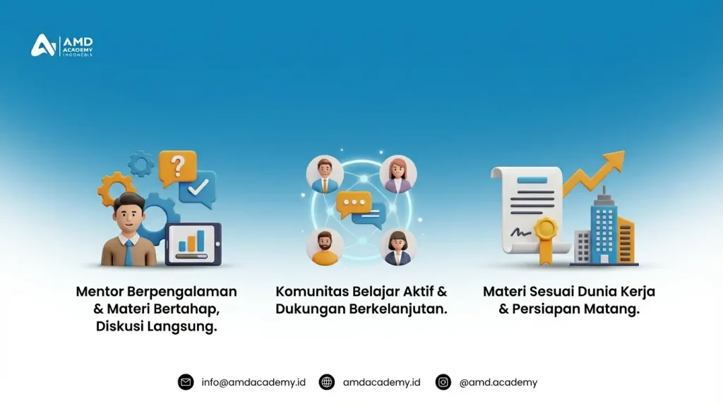 AMD Academy menjadi pilihan terbaik bagi banyak peserta karena menyajikan pengalaman belajar yang mudah dipahami dan relevan dengan dunia kerja. Para mentor yang berpengalaman memberikan arahan yang jelas dan sistematis. Selain itu, materi pelatihan disusun dalam bentuk modul bertahap sehingga peserta dapat mempelajarinya dengan ritme yang nyaman.