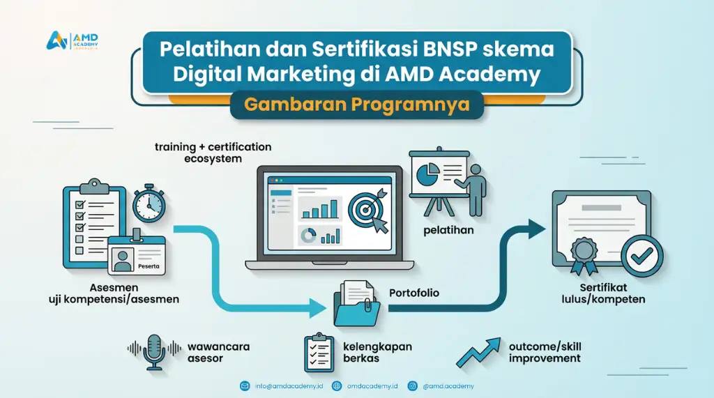 Artikel ini membahas alurnya dengan gaya santai, plus disesuaikan dengan produk Pelatihan dan Sertifikasi BNSP skema Digital Marketing dari AMD Academy berdasarkan informasi di website resminya.